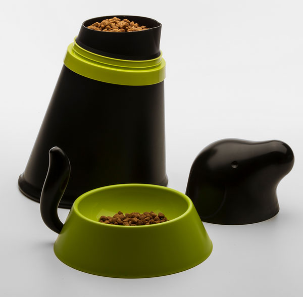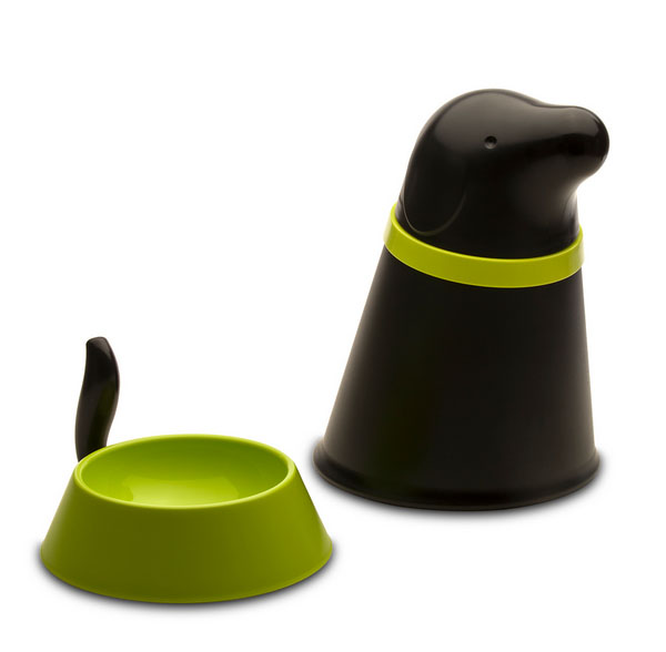 Ao tirar a cabeça encontramos o local para armazenamento de ração. Embaixo, o pote para o cão poder comer. Em um só lindo pacote, um item que todos nós temos em casa, mas com muito design.