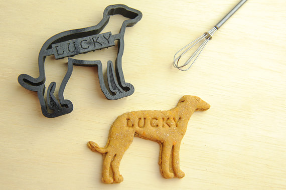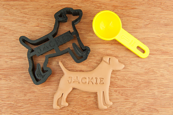 A NameThatCookie faz cortadores de biscoitos personalizados. São diversas opções de raças e vêm com o nome do seu cachorro.