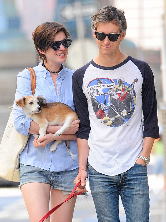 Anne Hathaway foi vista passeando em Nova York com o marido, Adam Shulman, e um novo cachorro.