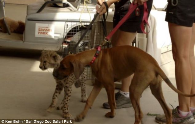 A cachorra Raina, que também é filhote e é da raça rodesiano de crista dorsal, acompanhou o guepardo em todos os momentos.