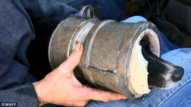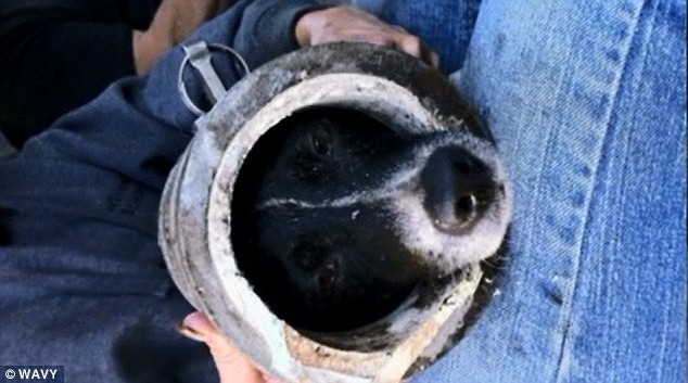 Seu dono tentou usar graxa para soltar o cão, mas não deu certo. Então, ele chamou o corpo de bombeiros, que levou o cachorro com uma parte do tubo para uma clínica veterinária.