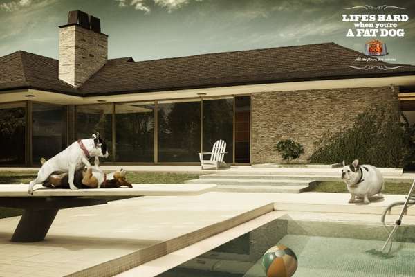 A campanha segue a mesma linha dos comerciais de dieta para humanos, no qual a pessoa acima do peso não namora e está sempre só por ser gordo.