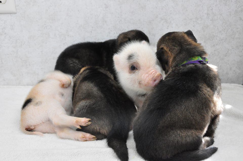 Os cães e os mini-pigs passam muito tempo juntos, se socializando e interagindo uns com os outros, fazendo com que sejam bebês felizes.