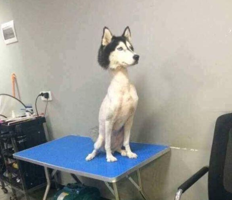A foto é tão estranha que parece ser uma montagem, mas não se engane, esse é um Husky Siberiano com corpo raspado.