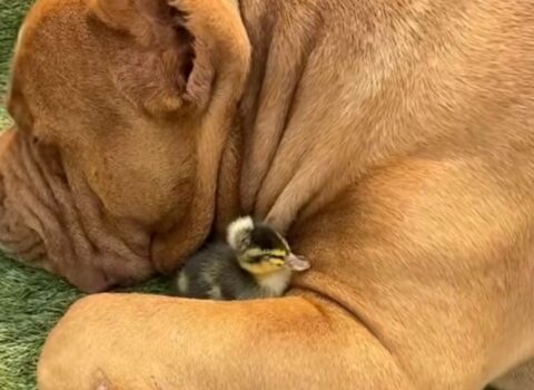 American bully de quase 80kg viraliza depois de “adotar” filhote de pato. Veja o vídeo!